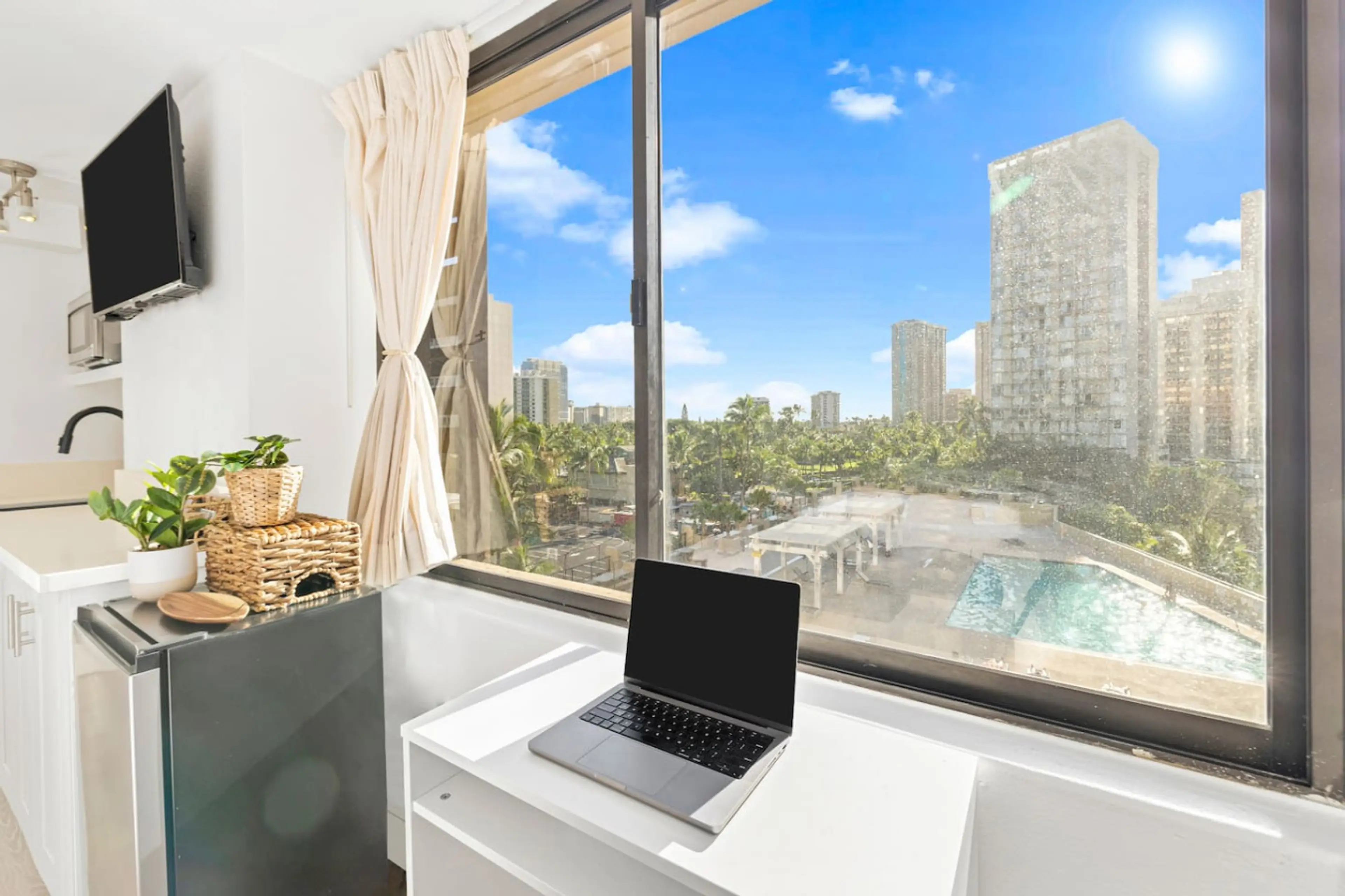 👋🏽 Aloha and e komo mai (welcome) to your getaway in Hawaii - the "Palm Room" 🌴at Waikiki! This studio was fully renovated in 2024 and is bright, modern, and offers a perfect blend of luxury, comfort, and breathtaking views. Impeccably clean, comfy queen bed, rain shower head, new AC, WiFi, rooft...